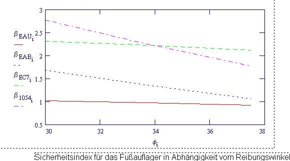 Untenstehend sind beispielhaft die Ergebnisse in Form des Sicherheitsindexes aufgetragen über die Basisvariable Reibungswinkel dargestellt. Die Kurven sind jeweils nach verschiedenen Sicherheitskonzeptionen berechnet worden. Die Indizes an der y-Achse geben die jeweilige Vorschrift an. Die Berechnungen wurden nach der 2.-Order-2. Moment-Methode für nichtlineare Grenzzustandsbetrachtungen durchgeführt.